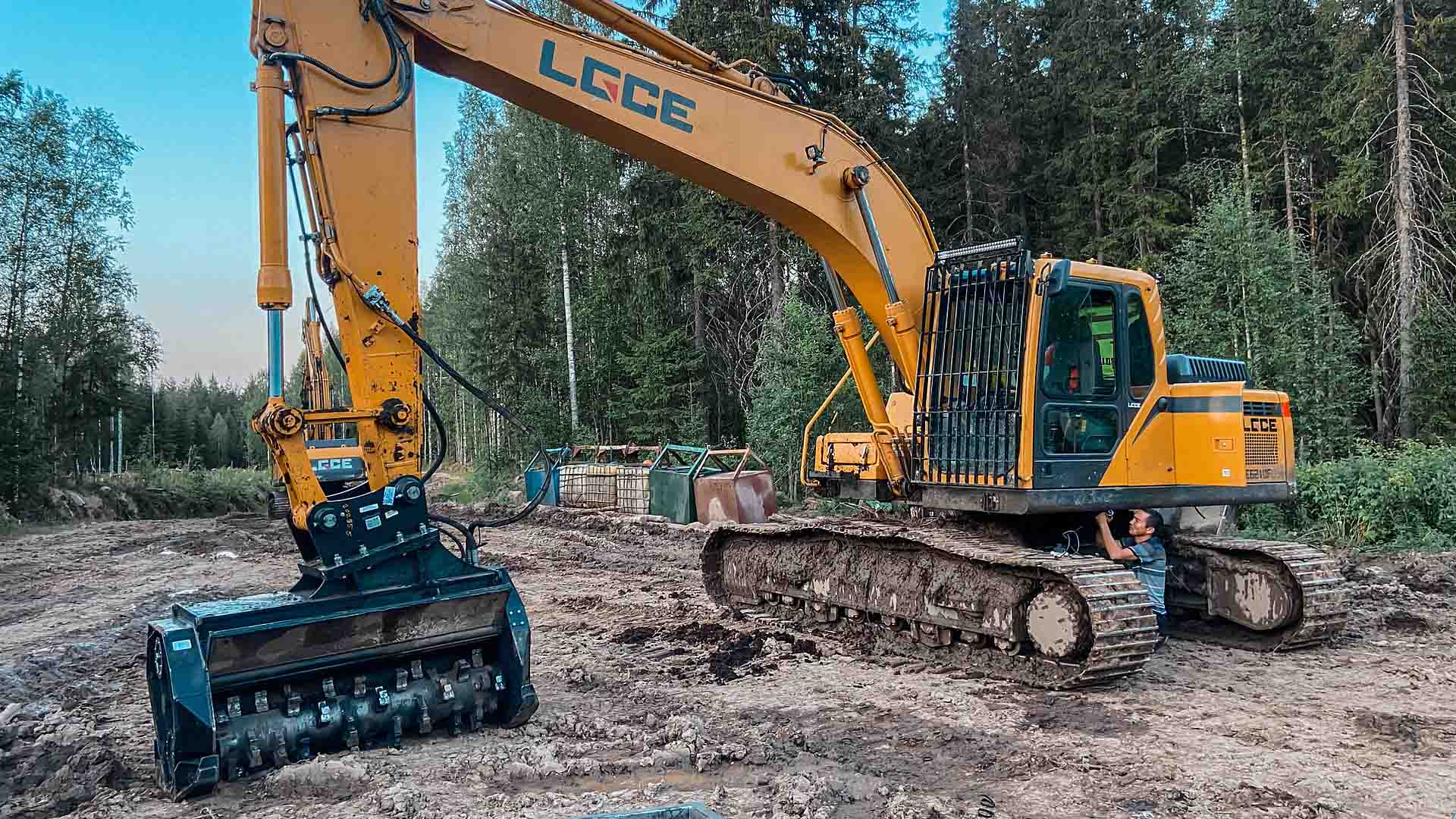 Текущая задача — проверить мульчер для экскаваторов массой до 25 тонн. Тестирование проходит в Карелии, где экскаватор LGCE E6210FLC, оснащенный нашим мульчером, используется опытным оператором, имеющим опыт работы с аналогичным оборудованием разных производителей. Это даёт всестороннее сравнение: оцениваем качество изготовления, производительность и удобство эксплуатации мульчера.